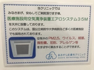 ●待合室・診察室・美容ルームには、医療施設用空気清浄装置を天井に設置しております。